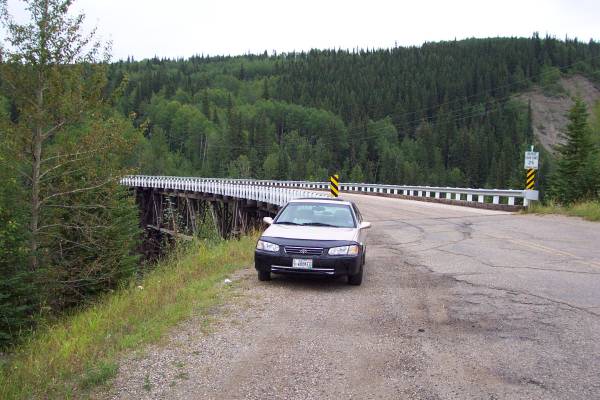 Today began cool and cloudy, with temperatures in the upper forties. As soon as I departed the motel, it began to sprinkle. I drove around town one more time for a few more pictures, then drove on towards Alaska. Reading "The Milepost," I learned of a side road that led to the only remaining wooden bridge built during the original construction. This particular bridge over the Kiskatinaw River had weight restrictions, so many of the heavy trucks using the highway needed to take a side road to ford the river, which they did not like to do. In the 1970s, a new portion of the road was constructed, and a new bridge that could handle the weight was built. This new section replaced 10 kilometers of the highway, but it is still possible to take the old section to see the bridge. It was an interesting bridge to see.