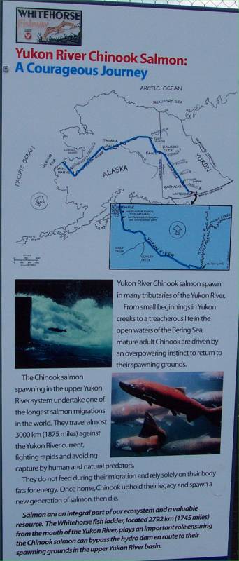 This panel describes how the salmon get up the fish ladder. |
