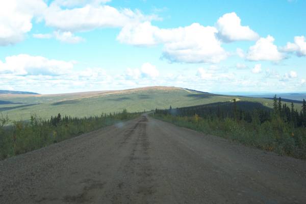 Today started with cloudy skies and fog, and the temperature was 45F. I checked out of the hotel and headed east to the junction of Route 5, the Dempster Highway, which will lead me to Inuvik, Northwest Territory. This is a 457 mile gravel road that is the only public road in North America that leads north of the Artic Circle (the Dalton Highway in Alaska to Prudhoe Bay is private road accessible by the public.) I am somewhat concerned about road conditions, but will drive carefully and take my time. One good thing was the weather, which had changed to partially cloudy and warm as the day progressed, including a temperature increase to 65 degrees.