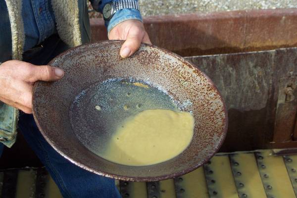 The pan is then worked to separate the gold from the remaining dirt. Here, the gold can be seen under his left thumb. |