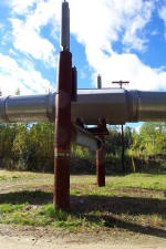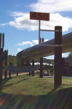 Here is one of the supports for the pipeline. As seen here, the distance in feet from the start is also posted. At the top of the vertical posts, radiators are used to help keep the ground cool and protect the permafrost. |