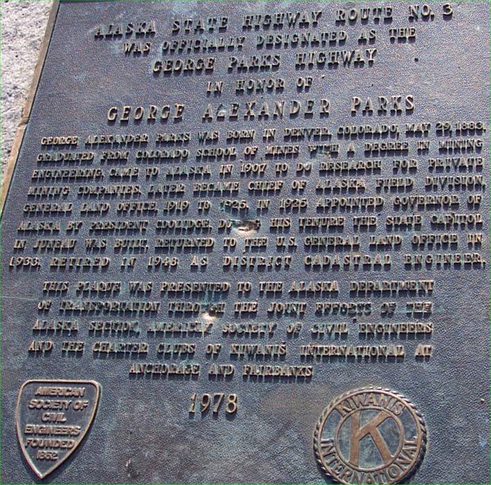 This plaque tells a brief history of George Alexander Parks, to whom the Parks Highway was named. |