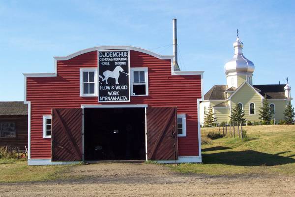 My next destination was outside of Edmonton, twenty miles east of the city. This is the location of the Ukrainian Cultural Heritage Center. The organization has collected original settlement churches, homes, and businesses, and brought them to this area to show what a typical 1929 Ukrainian immigrant village might be. People in costume portray citizens of that time, providing information about how the people of central-eastern Alberta lived. I had some nice conversations with the people, including Gordon and Steve (picture below.) Steve portrays John, the Blacksmith, while Gord portrays the hotel owner. The discussion involved quite a wide variety of topics! It was also very interesting to hear their perspective of past, as well as current events.