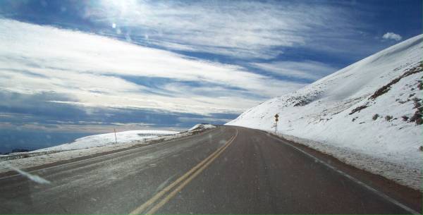 Highway 14 and Alternate 14 provided dramatic views while driving through the mountains. Temperature dropped from 63 to 36 degrees, with high level clouds moving in. Highest part of the drive was Observation Point, at 9430 feet.