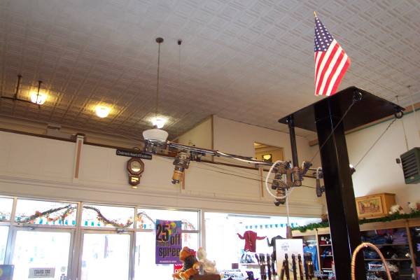 This is a wire and pulley system used for purchases. One person at one place would process all sales, and send the money to the upper office area above the front doors. This would allow all money to be placed immediately in the safe, and have only one person accountable! |