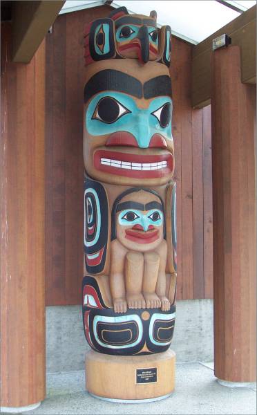 Continuing on Route 101, several historical markers were displayed. At a reservation, a totem pole with a sign describing it was exhibited.