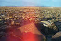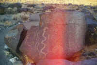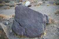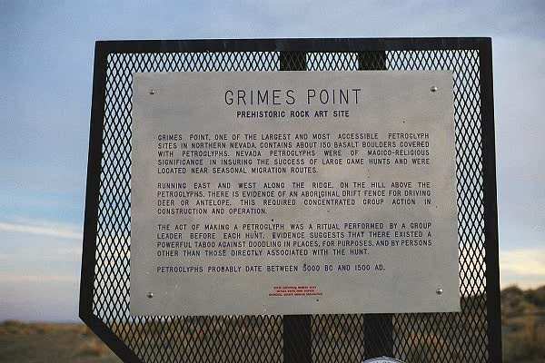 After participating in the continental breakfast provided by the Best Western in Fallon, I headed east on Route 50. About ten miles outside of town is an area called Grimes Point (360 degree panoramic view) (another Grimes Point site) which contains a grouping of petroglyphs. I took a self guiding trail that passed by hundreds of images etched into the rocks. Across the highway is the Fallon Naval Air Station, home of the Top Gun school. I was able to watch several pairs of what appeared to be F-18s take off.